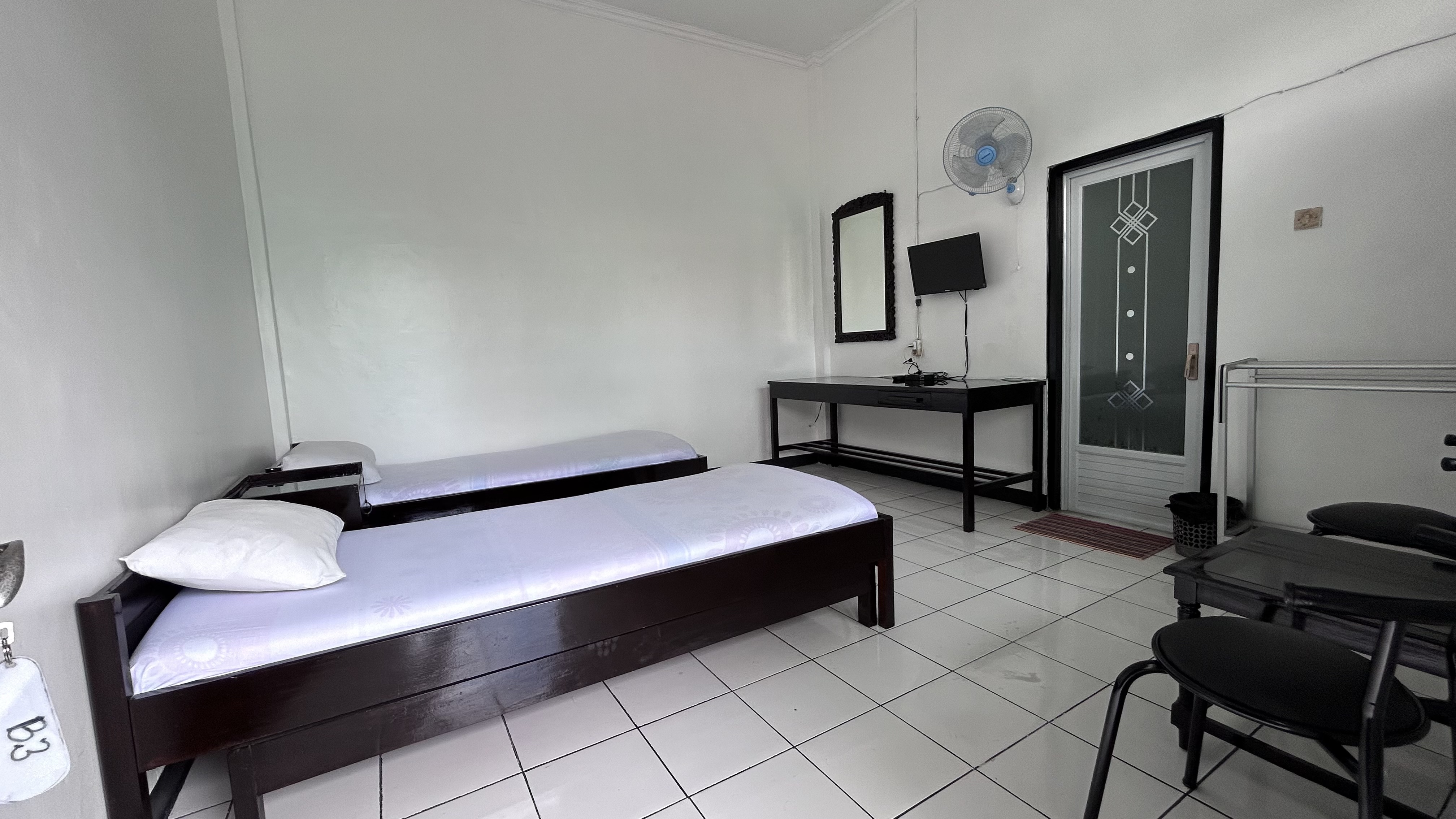 Dengan fasislitas : fan, TV, kamar mandi dalam